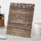 Rustic barn board background with watercolor eucalyptus greenery along the top and bottom with a cursive swash font calligraphy script welcoming guests to your wedding with your names and wedding date.