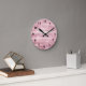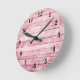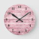 This rustic design features an image of pink distressed wooden barn boards with a faded damask pattern. Large, easy-to-read black numbers encircle the edge. A unique addition to your shabby chic or farmhouse decor.