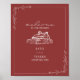 Wedding welcome with rustic barn illustration over muted red background.