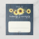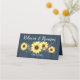 Pretty sunflowers over blue barn wood background, folded seating card with white area for hand writing names and table number and personalised names and message on reverse side.