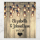 Rustic barn wood and Edison string lights couple's names wedding wine labels.