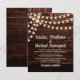 Wedding invitation with a rustic dark brown barn wood background and sparkling string lights