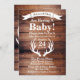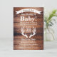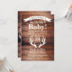 Rustic baby shower invitation with a warm rustic feel of barn wood planks and deer antlers silhouette. The backside features another antlers silhouette around a heart.