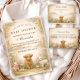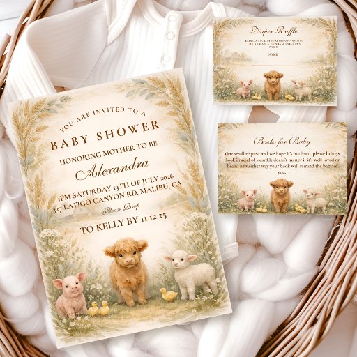 A charming countryside design featuring a fluffy calf, a sweet little lamb, and tiny yellow chicks nestled among soft meadow wildflowers. The warm parchment background and muted earth tones create a cozy, rustic atmosphere with a gentle storybook feel. Delicate greenery frames the layout while the farm animal illustration adds warmth and personality. Perfect for a neutral rural-themed celebration with classic farmhouse charm.