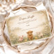 A charming countryside design featuring a fluffy calf, a sweet little lamb, and tiny yellow chicks nestled among soft meadow wildflowers. The warm parchment background and muted earth tones create a cozy, rustic atmosphere with a gentle storybook feel. Delicate greenery frames the layout while the farm animal illustration adds warmth and personality. Perfect for a neutral rural-themed celebration with classic farmhouse charm.