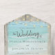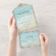 This all-in-one wedding invite includes the invitation and tearaway RSVP, and can be folded and mailed so you don’t need an envelope. Framed with a background of rustic weathered gray wood, beautiful aqua blue ocean waves crash against the beach and string lights decorate the top. These wedding invitations are perfect for destination weddings, as well as any beach and coastal themed wedding.