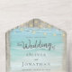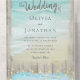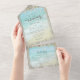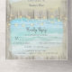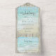 This all-in-one beach destination wedding invite includes the invitation and tearaway RSVP, and can be folded and mailed so you don’t need an envelope. Framed with a background of rustic weathered grey wood, beautiful aqua blue ocean waves crash against the beach and string lights decorate the top. Please see the collection for many matching products.