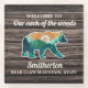 Glass coaster for the family mountain/wilderness home. A bear overlaid with green mountains and a compass sits on a rustic dark brown wood background. Customisable text says, "Welcome to our neck of the woods." Personalise further with your family name and the location of your home. Or choose other text.