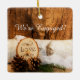 Commemorate the day he proposed and you said yes and celebrate your first Christmas as a newly engaged couple with the charming Rustic Birch Tree and Barn Wood Engagement Ornament. This casual yet classy custom woods or forest theme engagement Christmas ornament features a quaint nature photograph of a white birch tree branch, wood slice with the words LOVE burned on it, two brown pine cones, green pine tree branch and white bridal veil with a rustic and weathered brown barn wood background.