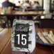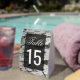 Elegant wedding table number featuring modern typography against a rustic birch bark background.
