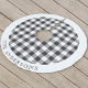 Custom-designed Christmas tree skirt featuring personalised family name on a festive black and white buffalo check/plaid/gingham check pattern.