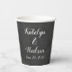 Whimsical wedding paper party cups design features a white wedding monogram with date in a stylish handwritten script font. Black chalkboard style background with a rustic textured look.