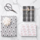 Wrapping paper sheet set of 3. Designs feature a black silhouette of a reindeer head inside a red oval, rustic black and white tartan pattern, The words "Merry Christmas" tiled in a red serif font. The message can be personalized.