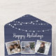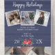 Stand up from the crowd with your seasonal greetings! This unique holiday card with a rustic blue wood background and string lights will add a special touch to your holiday stationery. Personalise this beautiful card with your favourite pictures. This fits 4 custom photographs. Edit with your family name and year.
