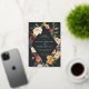 Elegant floral wedding invitations or fall or winter weddings feature your details nestled inside an elongated diamond surrounded by watercolor roses, mums and greenery in rustic autumn colours including peach, ivory, blush, burgundy and green on a rich soft black background. Gold foil trim completes the design.