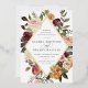 Elegant floral wedding invitations or fall or winter weddings feature your details nestled inside an elongated diamond surrounded by watercolor roses, mums and greenery in rustic autumn colours including peach, ivory, blush, burgundy and green. Gold foil trim completes the design.