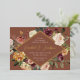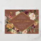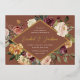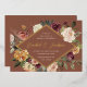 Elegant floral wedding invitations or fall or winter weddings feature your details nestled inside an elongated diamond surrounded by watercolor roses, mums and greenery in rustic autumn colours including peach, ivory, blush, burgundy and green. Gold foil trim completes the design.