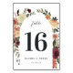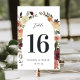 Rustic elegant table number cards feature an arch of watercolor rose and mum flowers in autumn shades of marsala, burgundy, blush pink, and ivory with green foliage. Your table number, event date and additional custom text appears in the centre. Design repeats on reverse side. Coordinates with our Rustic Bloom elegant floral wedding invitation suite for fall or winter weddings.