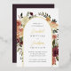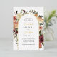 Elegant floral wedding invitations or fall or winter weddings feature your details framed by an arch of watercolor roses, mums and greenery in rustic autumn colours including peach, ivory, blush, burgundy and green, with sleek gold foil trim and gold calligraphy script lettering on a white background. A modern and elegant design for rustic chic weddings in the fall or winter months.