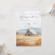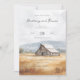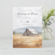 This wedding invitation features a serene, pastoral theme with a watercolor-style illustration of a rustic barn set against rolling hills. The colour palette includes soft blues, greys, and earthy tones, creating a calm and inviting atmosphere. Elegant script and serif fonts are used for the text, which is arranged in a centred layout to enhance readability. The design captures the essence of a countryside setting with its realistic yet stylised representation, making it perfect for couples seeking a charming and simple aesthetic for their special day.