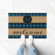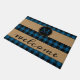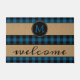 Fun doormat with contemporary black and blue chequered plaid pattern on burlap background. Stylish rustic unique design with room to customise or personalise with your family name monogram. Original personalised monogrammed outdoor decor accent for decorating the front porch or yard of your country cottage house, log cabin, mountain lodge, fishing camp, lake or river vacation home.