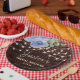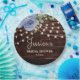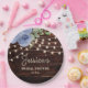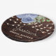 Rustic dark brown wood bridal shower paper plates with periwinkle blue watercolor floral and glittering string lights, customised with the bride's names and shower date. Contact us for help with customisation or matching products.
