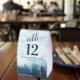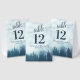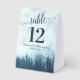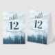 These tent signs will not only help your guests find their tables, they'll also make your wedding reception more beautiful. The design is both rustic and elegant featuring a mountain scene with a blue pine tree forest shrouded in mist or fog. The title is in lacy script calligraphy with bold numbers so your guests can easily find the right table. There is room for the names of the couple and the wedding date.
