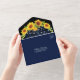Rustic Wedding, Watercolor Sunflower Floral, Blue Wood and String Lights Wedding All In One Invitation with RSVP Card includes yellow sunflowers and greenery.