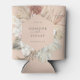 Beautiful rustic boho-chic dried palm fronds, roses and orchid geometric frame on pink sand colour background, personalised can cooler. Designed to match our Bohemian Oasis Wedding Collection.