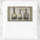 Rustic, still life art with 3 antique bottles in muted tones of green and brown.