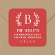 Custom printed holiday return address labels personalised with your family monogram and address or other custom text. This modern rustic design has simple white laurel branches framing your monogram initial with a mix of fonts on a red background. Use the design tools to choose any background colour, edit the text fonts and colours or upload your own photos to create a one of a kind square return address sticker.