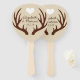 Rustic farmhouse wedding style hand fans featuring a brown deer antlers, couple's names, wedding date, and a white heart design.