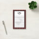Rustic red and black buffalo check plaid notepad with monogram letter framed by deer antlers. The lined area features a deer head silhouette watermark.