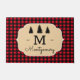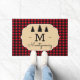 Add some holiday cheer to your front porch or entryway with this stylishly bold doormat. The red and black buffalo check plaid design adds cozy woodland warmth to our doorstep. It's perfect for fall and Christmas decorating! The doormat features your family's monogram letter and name in script accented with black forest tree silhouettes above.