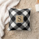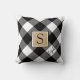 Black and white buffalo check plaid throw pillow with monogram on centre brown square with white and black borders. Personalise further with a name in a modern handwritten script font or delete the sample name to leave the area blank. CHANGES: The back side is a solid black colour that can be changed as well as the text font style, size, colour and placement can also be changed for a custom look by clicking on CUSTOMIZE FURTHER under the PERSONALIZE section. Contact the designer via Zazzle Chat or makeitaboutyoustore@gmail.com if you'd like this design modified, on another product or would like coordinating items.
