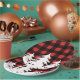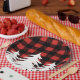 Rustic and bold red and black buffalo check plaid background paper plates. They also feature a white forest trees silhouette. These plates are great for baby showers!