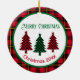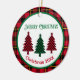 This plaid Christmas ornament features charming holiday trees in red and black and green and black buffalo plaid. Merry Christmas is displayed in a fancy festive font at the top, with the year displayed below. Make sure to type the current year in the template, or delete the text at the bottom if you don't want it. A red and green plaid borders the ornament.