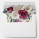 For convenience in getting your wedding invitations ready for mailing, this envelope design includes a text template on the back flap for personalizing with your name and return address. The inside flap has rustic burgundy and off-white roses with eucalyptus and trailing greenery. The color of this envelope coordinates with matching wedding invitations and has a light gray-beige background.