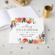 Stylish white wedding guest book design features stylish custom text that can be personalised with the bride and groom's names and wedding date. Text is framed by a beautiful floral frame of summer and fall watercolor flowers, including roses, dahlias, peony flowers, and greenery, in a gorgeous autumn palette of burgundy red, golden yellow, peach orange, blush pink, and shades of green. A coordinating burgundy red background appears on the back of the book with a floral bouquet.