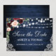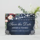 Rustic Blue Wood String Lights Lace and Watercolor Burgundy Marsala Blue Floral Bouquet Save the Date Card