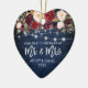 Rustic Blue Wood, Modern Brush Script, Watercolor Burgundy Marsala Floral, Our First Christmas as Mr. and Mrs. Heart Wedding Ornament with String Lights