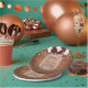 Perfect for country boho weddings, these rustic floral paper plates feature a bouquet of burgundy and blush flowers on top of a mason jar with the names of the bride and groom and the wedding date inside. String lights decorate the top of the design, with a rustic wood background.
