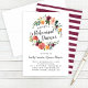 Stylish wedding rehearsal invitation features a rustic wreath of summer and fall watercolor flowers, including roses, dahlias, peony flowers, and greenery, in a gorgeous autumn palette of burgundy red, golden yellow, peach orange, blush pink, and shades of green. Personalise the elegant burgundy and dark grey text for your special event. A coordinating burgundy striped pattern dresses up the back of the card.