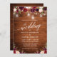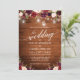 Rustic Wood, Modern Calligraphy Script, Watercolor Burgundy Floral Wedding Invitation with Burgundy and Pink Roses. Glowing String Lights with Mason Jars.