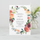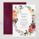 Our wedding invitation features a burgundy, orange and blush watercolor floral wreath. Perfect for fall and winter weddings.