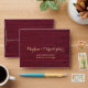 This rustic country design features gold string lights, sunflowers, and burgundy marsala sprigs on the inside of the envelope against a maroon burgundy red barn wood background. A customisable name and return address appear on the front in pale gold in popular script and serif typography on the same burgundy wood background. You can personalise this invitation for your own wedding by changing the text in the template.