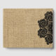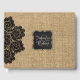 Elegant and rustic wedding guest sign in book done in a natural burlap look with graphics of a black lacy doily. A black decorative text area, on the front of the book, has the brides and groom's names ready to personalise.