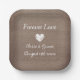Rustic burlap background country wedding party Paper Plates. Vintage design with weathered heart symbol. Great design for guests at your rustic country chic wedding. Personalise with bride and groom name in elegant script typography. Square or round shape options.