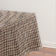 A painting of a rustic burlap design has been modified into a weave pattern, giving it a wonderful basket weave look, is tiled on table cloths. The colours are brown, tan, and black, and it looks very decorative.