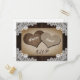 Rustic RSVP postcard with meal selections featuring two burlap hearts on a burlap and rustic wood background decorated with lace. Matching items available.